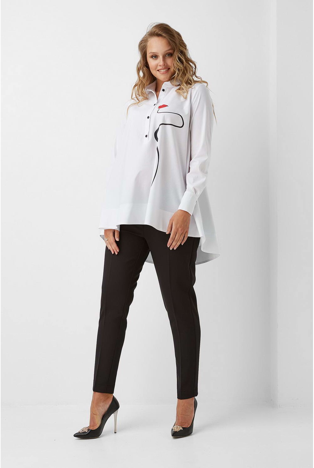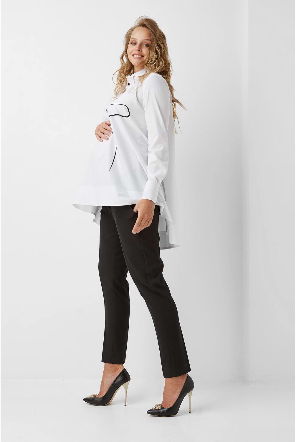 Нарядная блузка с рисунком спереди. Сочетается с любыми брюками или джинсами, отлично скроет растущий животик.