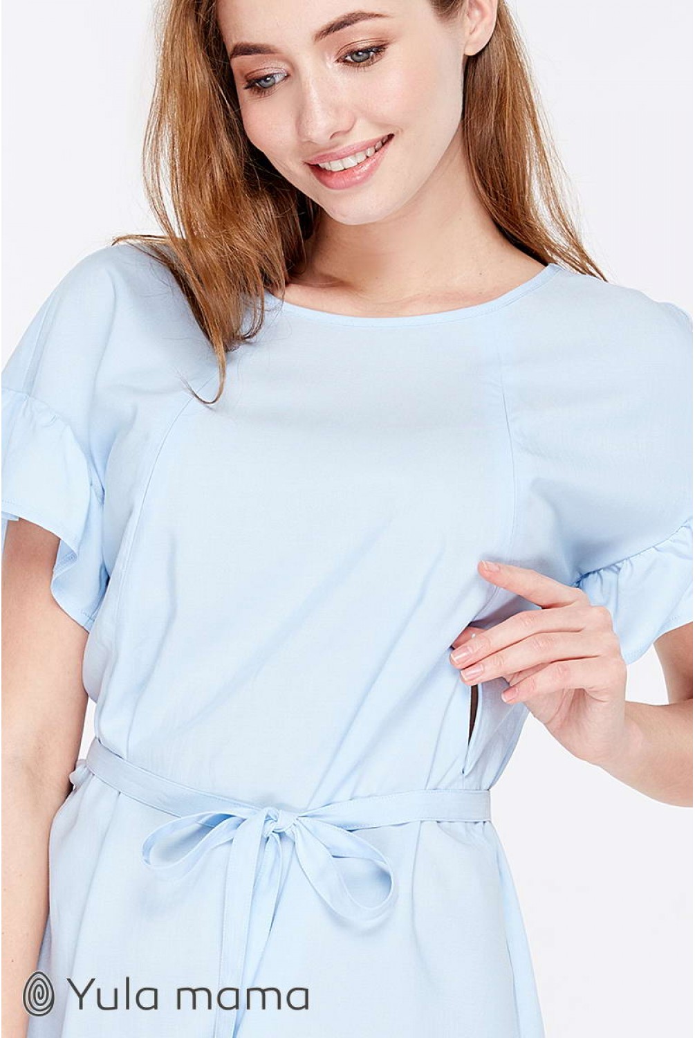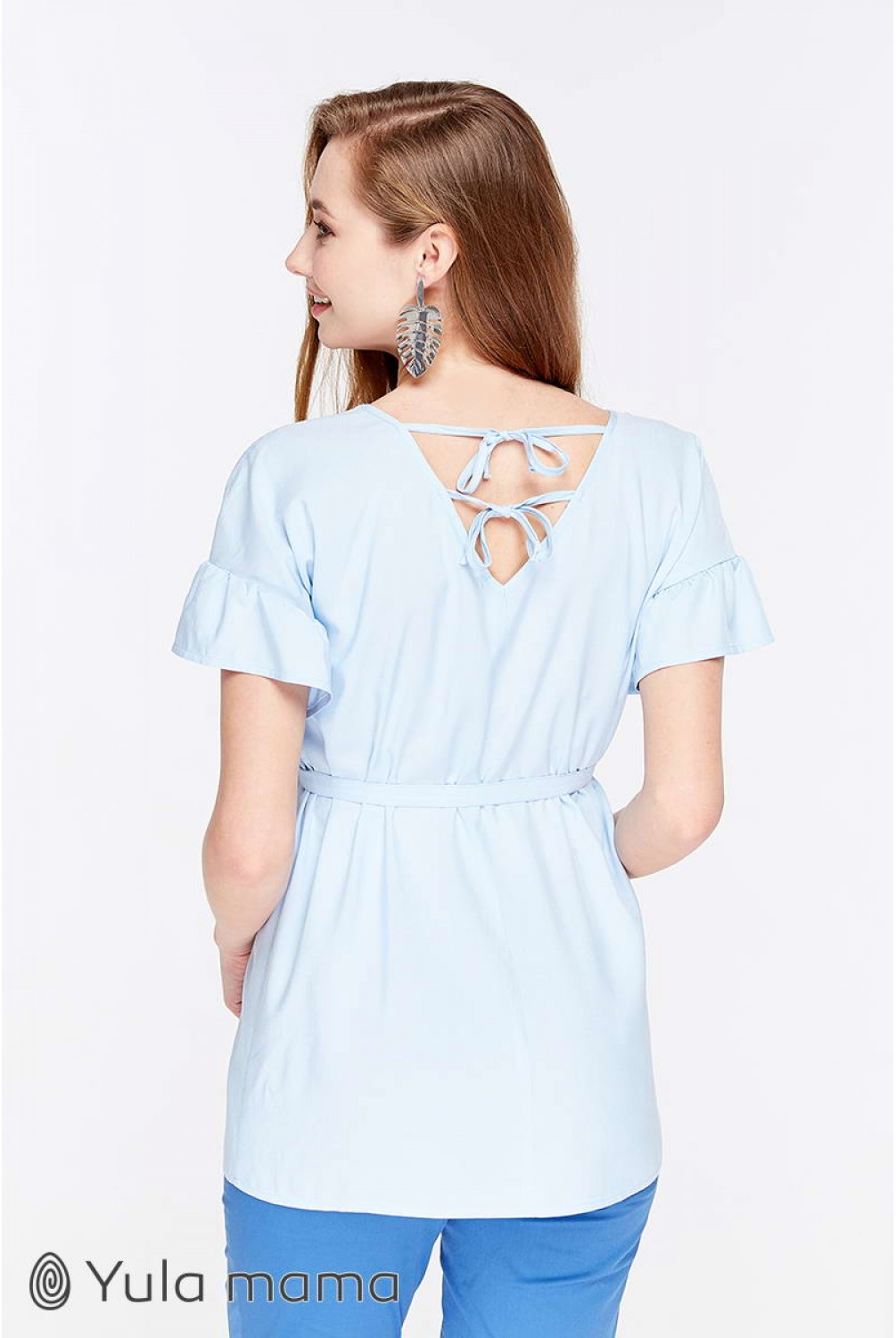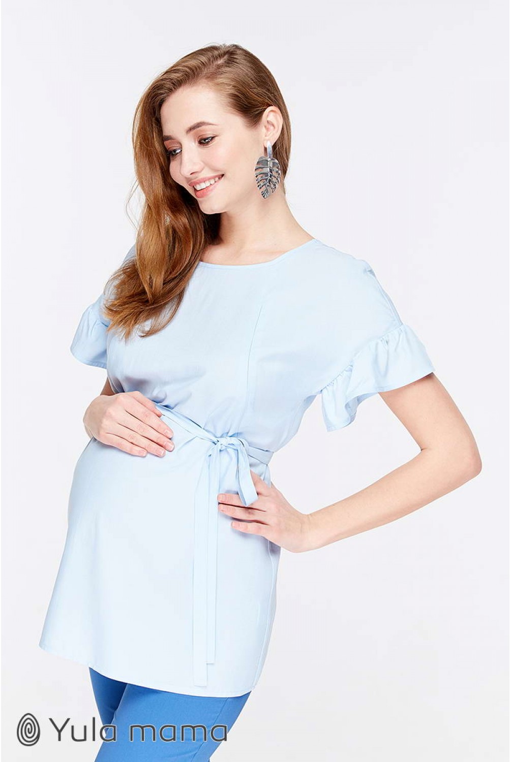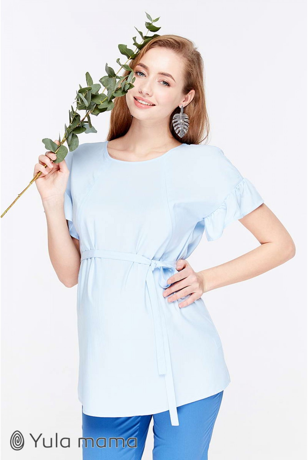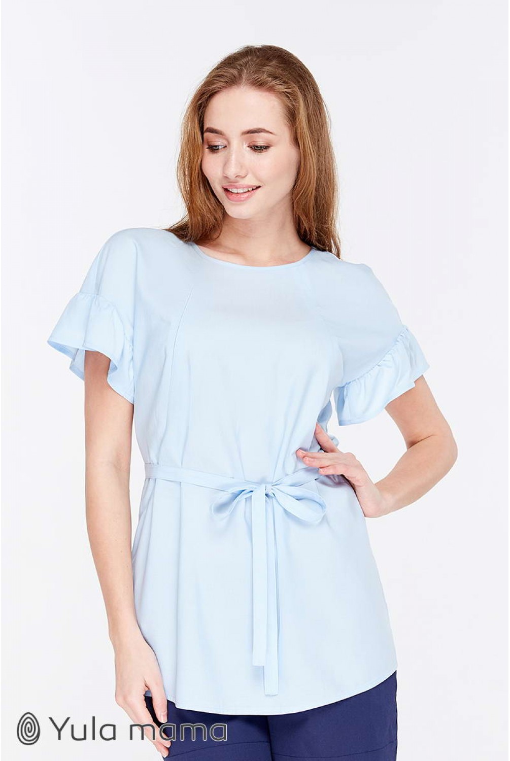 Блуза Marion голубого цвета для беременных и кормящих. Трендовая блузка с рукавом-оборкой. Силуэт: средней свободы, с оборкой по плечам. Дышащая ткань и удачно замаскированный секрет для кормления (потайные молнии в нагрудных рельефах) сделают эту модель для вас любимой на летний период.