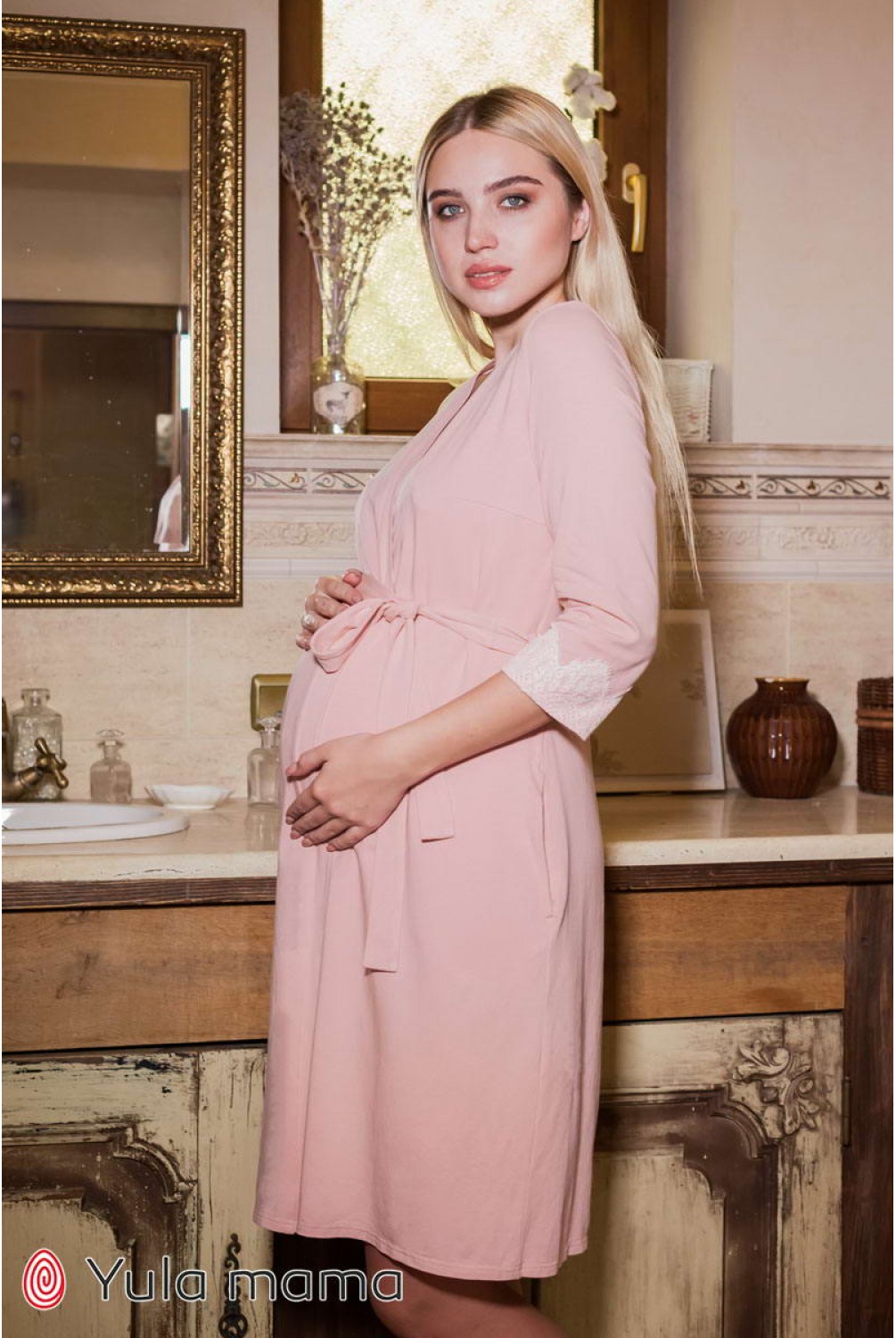 Красивый комплект из ночнушки и халата с кружевом для беременных и кормящих мам. Силуэт: ночнушка - облегающий лиф с поддержкой груди (можно не использовать бюстгальтер) и свободная юбка, халат - свободный А-образный силуэт на зап'ах. Секрет кормления: отстегивающаяся чашка с застежками baby-clip, зап'ах на груди.