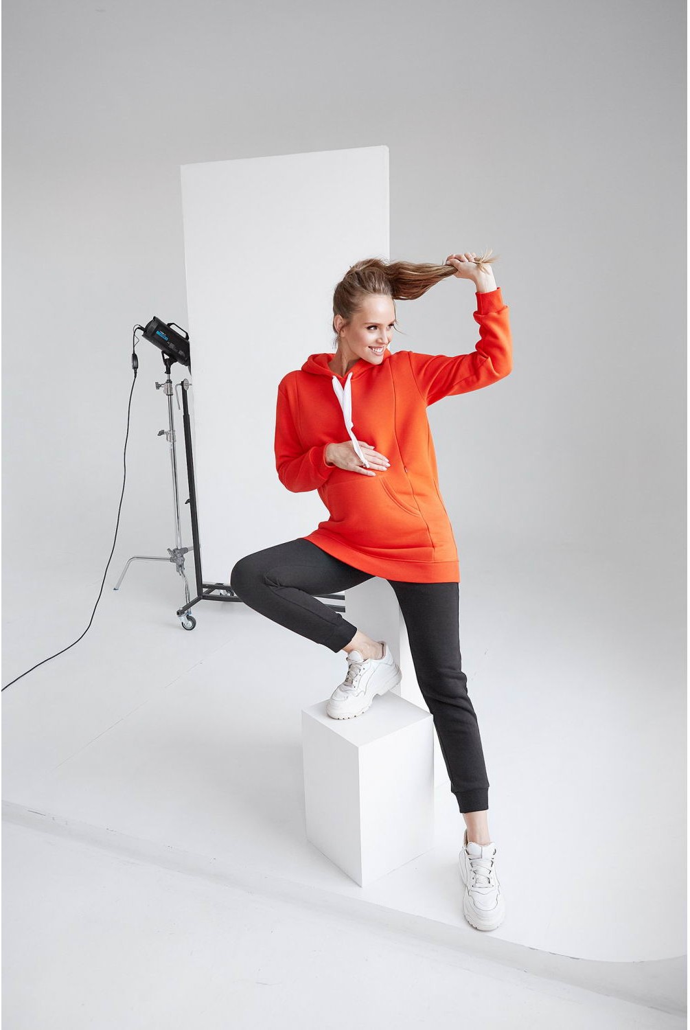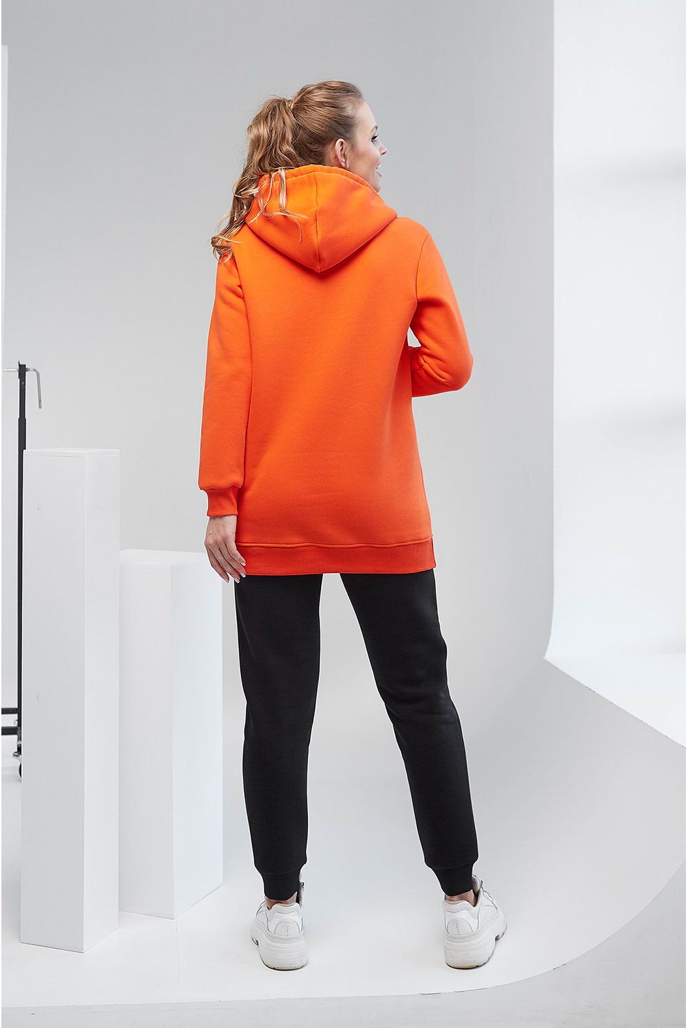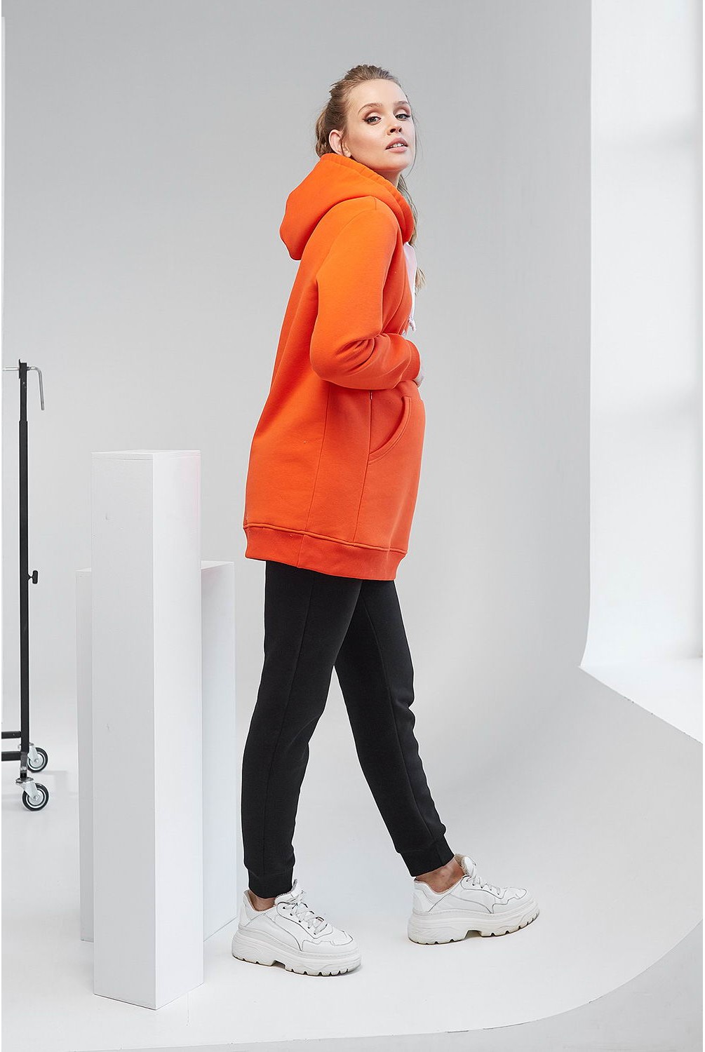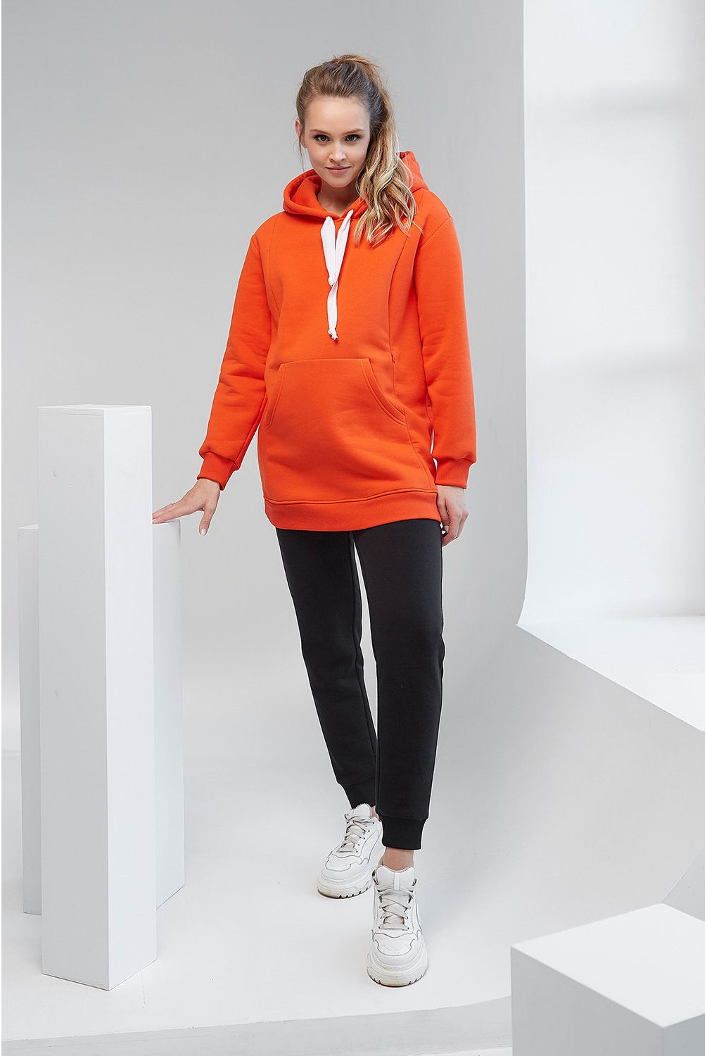 Яркая и теплая кофта-худи арт. 2105 1421 оранжевого цвета с карманами на животе и скрытыми молниями для кормления малыша.