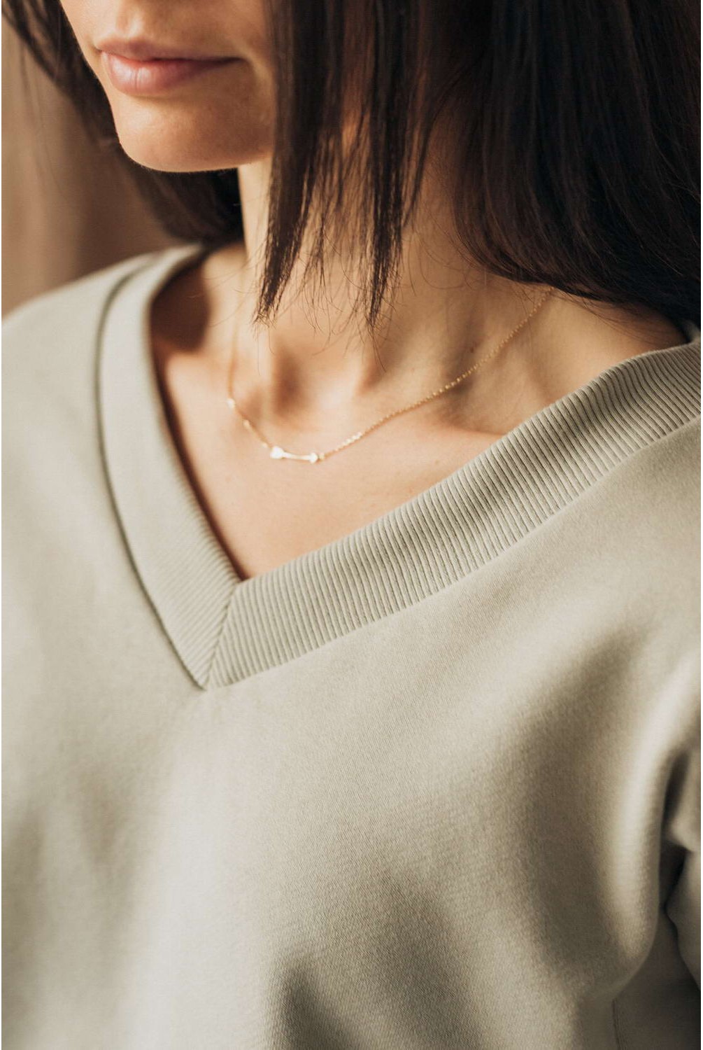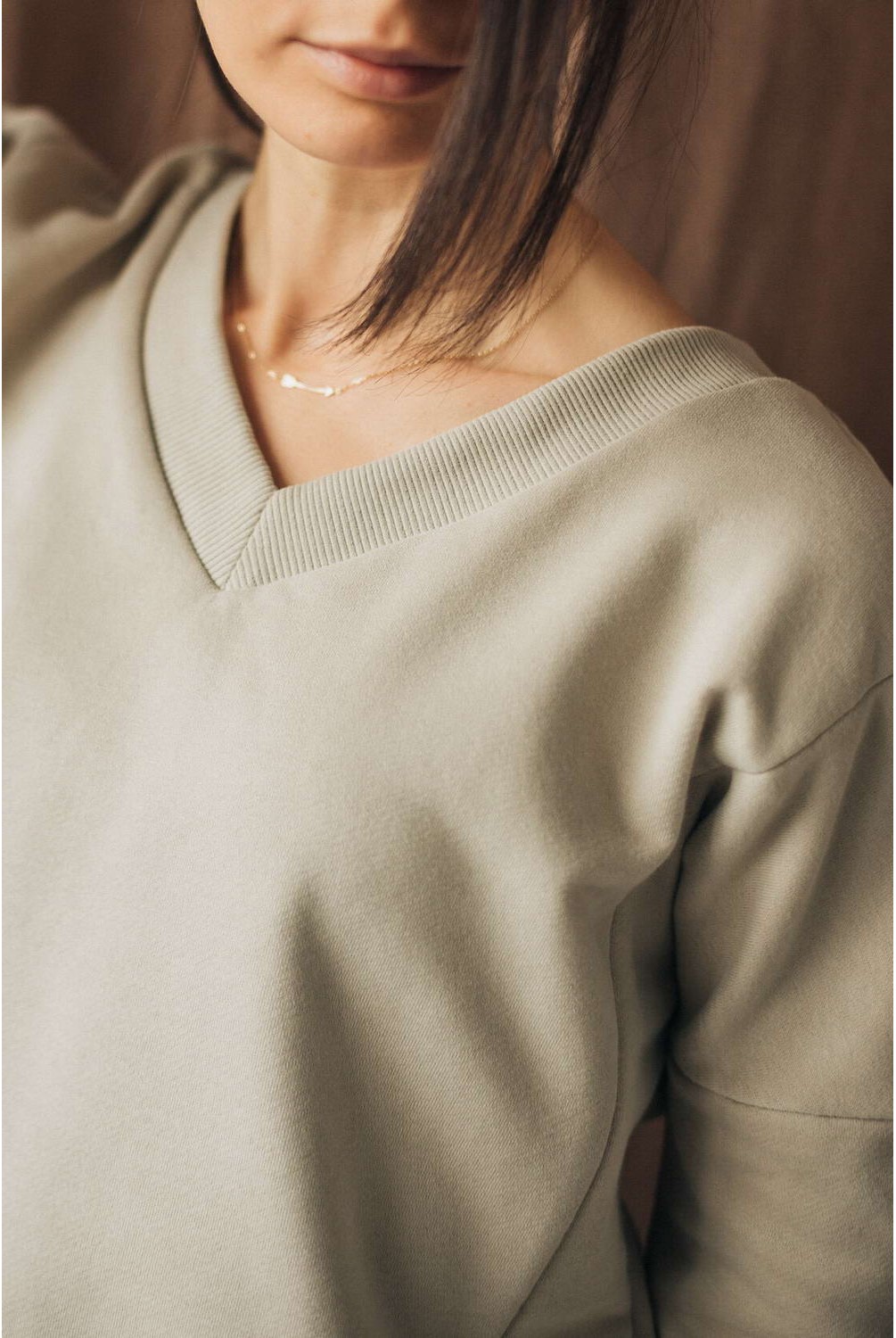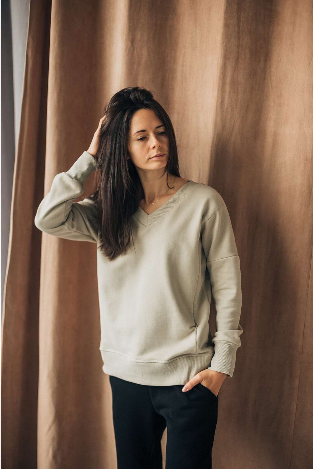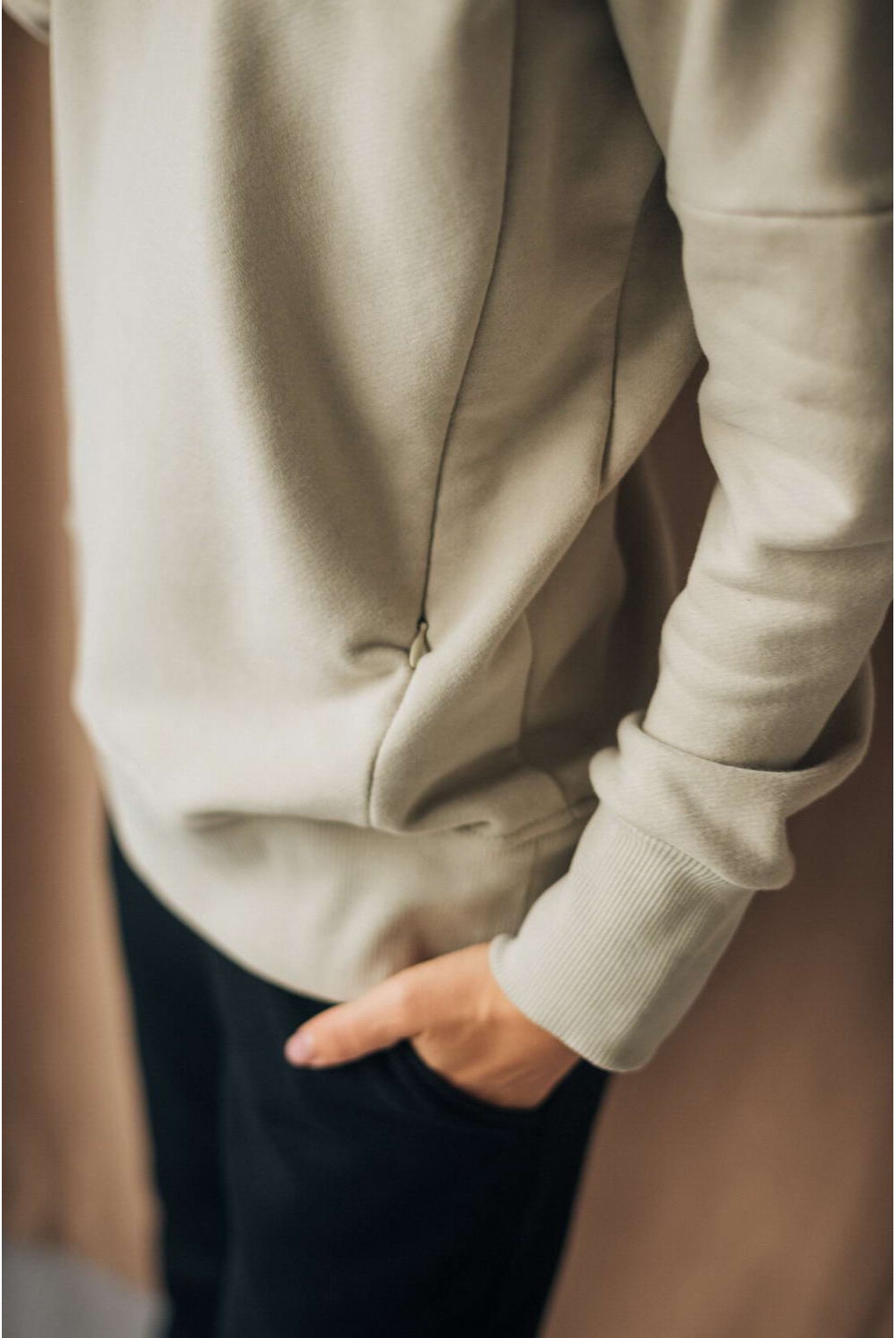 Теплый свитшот в цвете Белый песок для кормящих мам. Свитшот свободной посадки со спущенной линией плеча. Рукава с манжетами (кашкорсе). Горловина - треугольный вырез (кашкорсе). Широкая резинка по низу. Секрет для кормления: 2 потайные молнии, вшитые в вертикальные рельефы.
