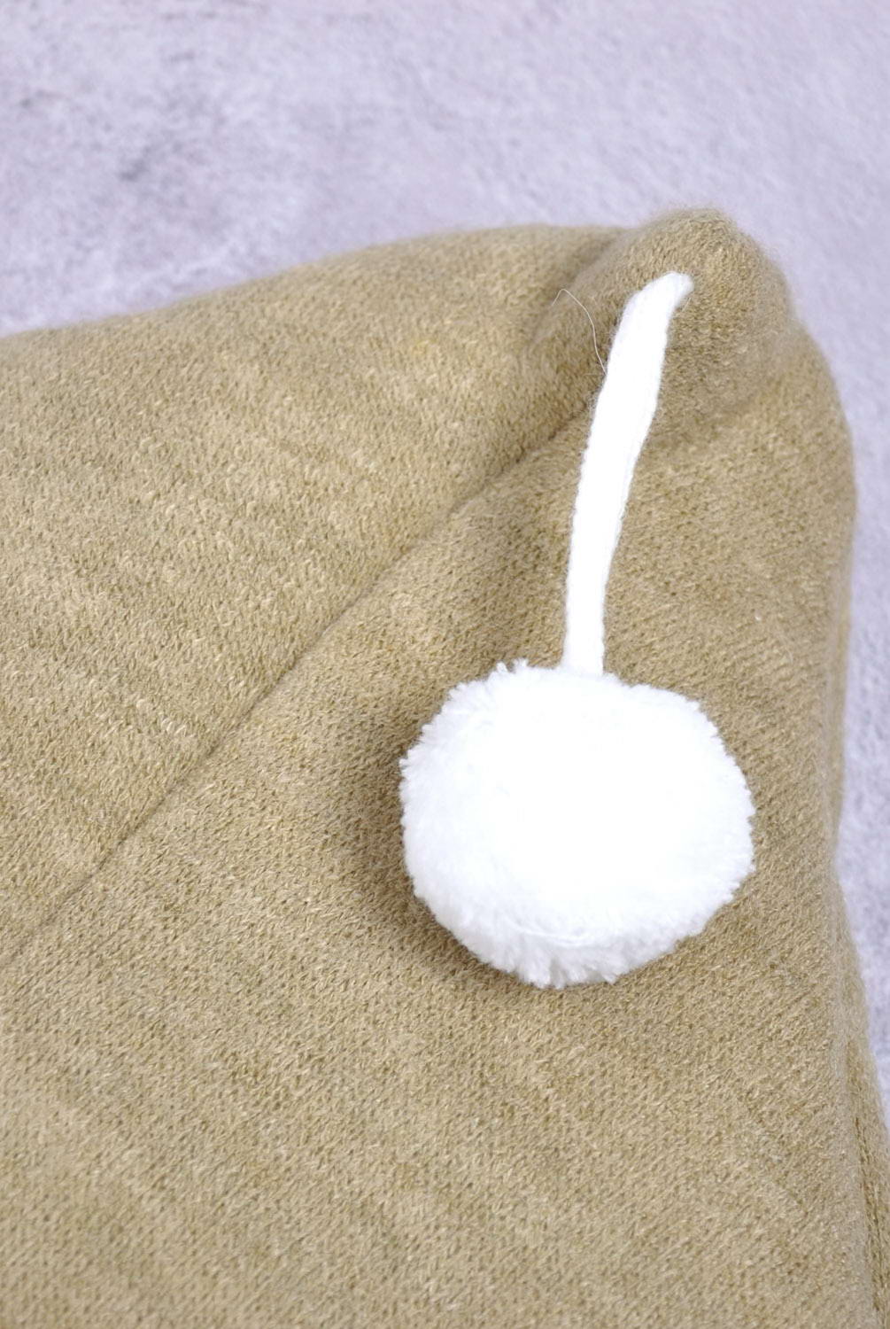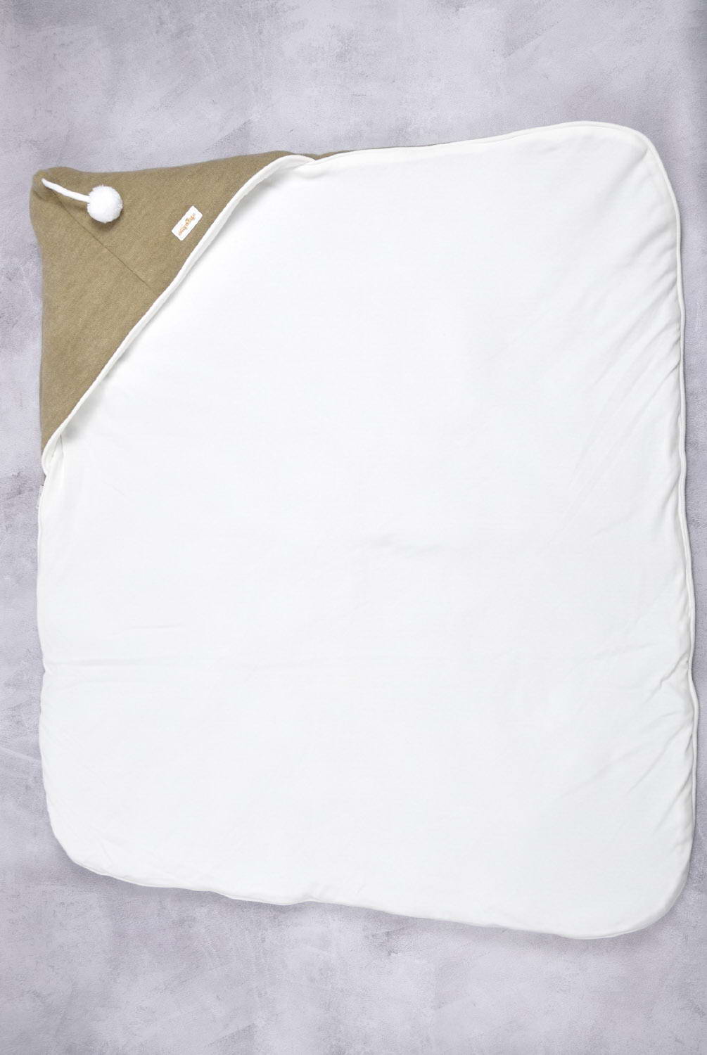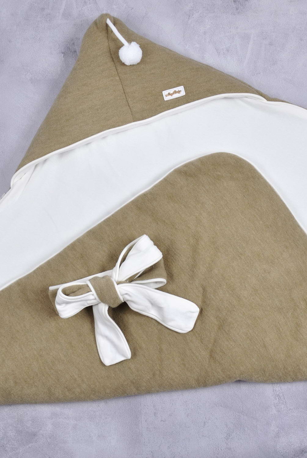 Конверт-одеяло на выписку Гномик на трикотаже оливкового цвета. Конверт разворачивается в полноценное одеяло, один угол которого декорирован «капюшоном». Так что относите «гномика» долго, как одеяльце, это точно. Сделан снаружи конверт из ангорового трикотажа (100% акрил). А внутри из трикотажа, только уже хлопкового (100% хлопок). Все конверты этой серии имеют в наборе пояс, которым завязывается сам конверт. И ещё одеяльце, а, точнее, его капюшон декорирован очень забавным бубоном-помпоном, который уж точно дополняет образ.