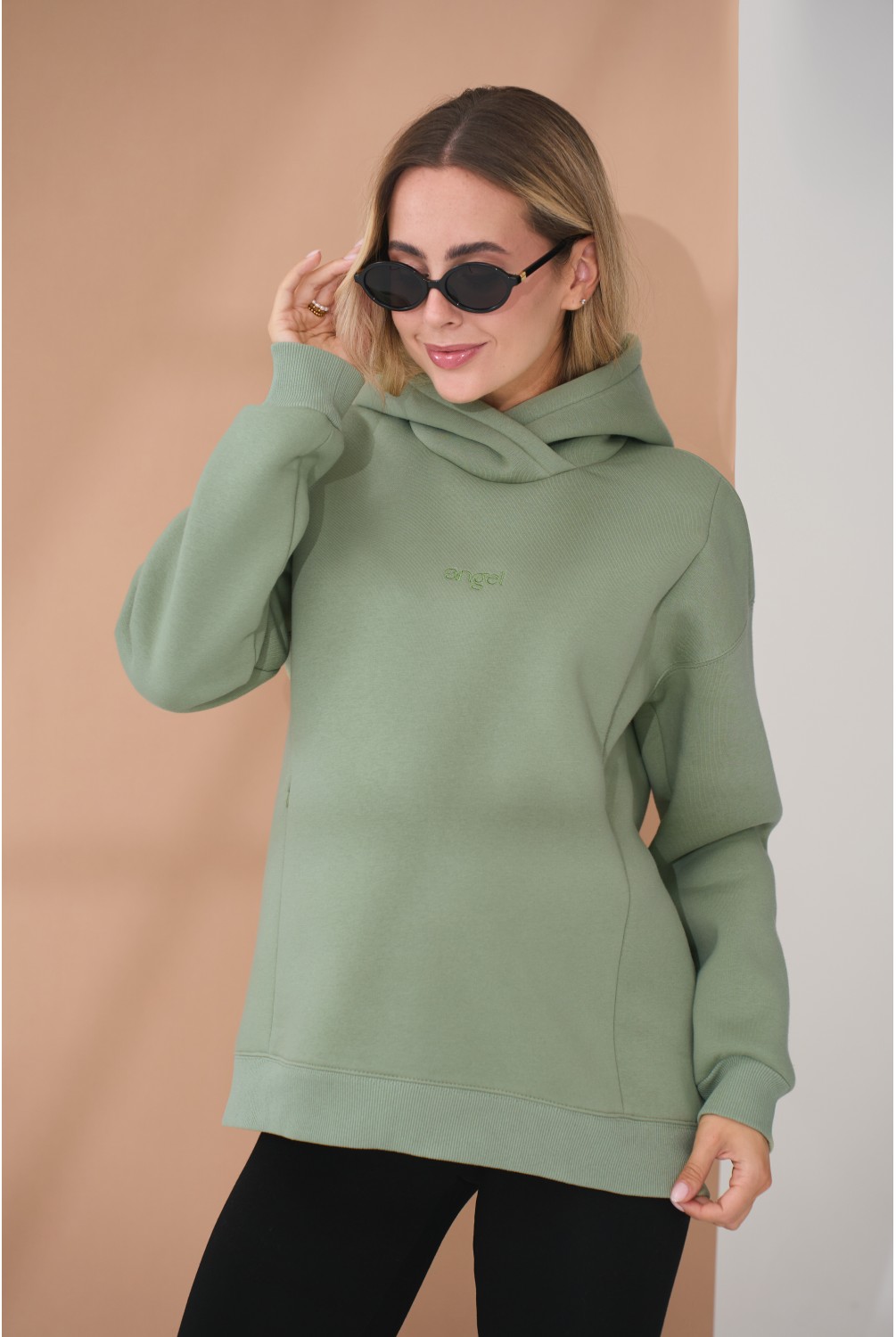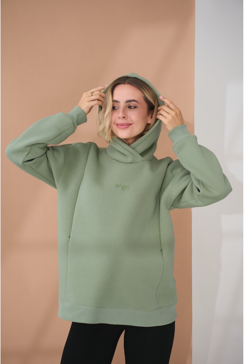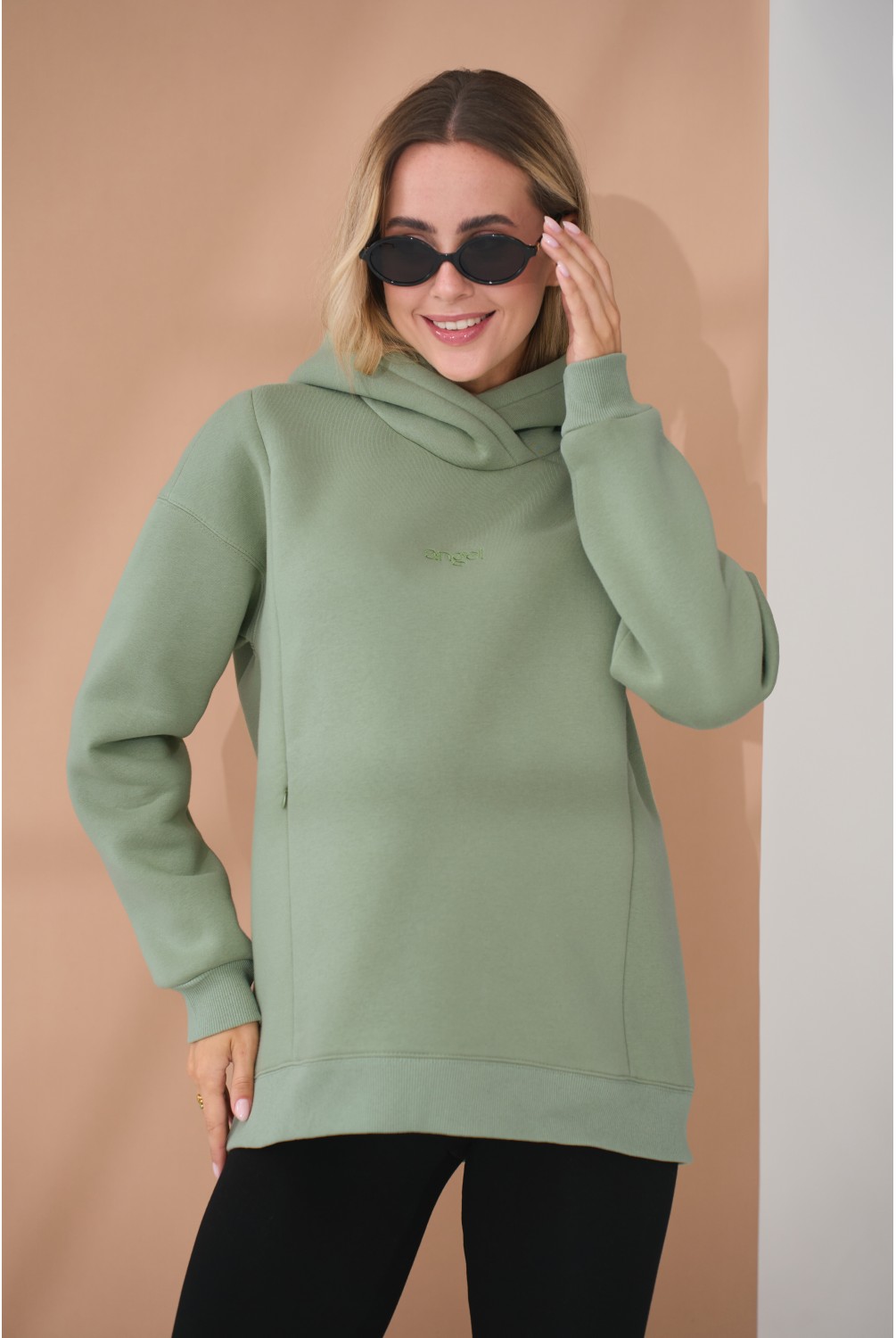 Теплий худі для вагітних та годуючих з вишивкою на грудях Angel оливковий Yula Mama