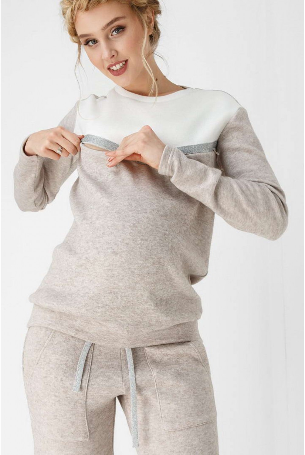 Ця кофтинка просто створена для ніжних образів. Поєднання білого і меланджу виглядає дуже стильно, а срібні вставки на грудях додають контрасний акцент. Трикотажний матеріал гарно носитиметься та зігріватиме вас і малюка. Також ми подбали і про зручне годування малечі за допомогою блискавок, які приховані під срібними вставками. Ця кофтинка точно стане вашим фаворитом!