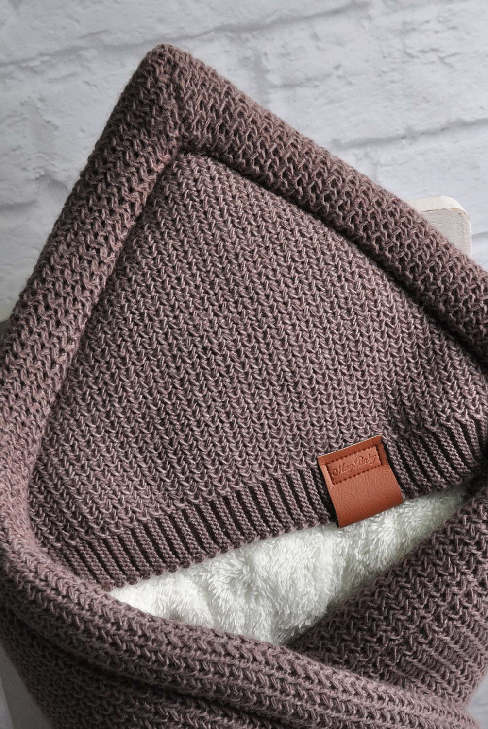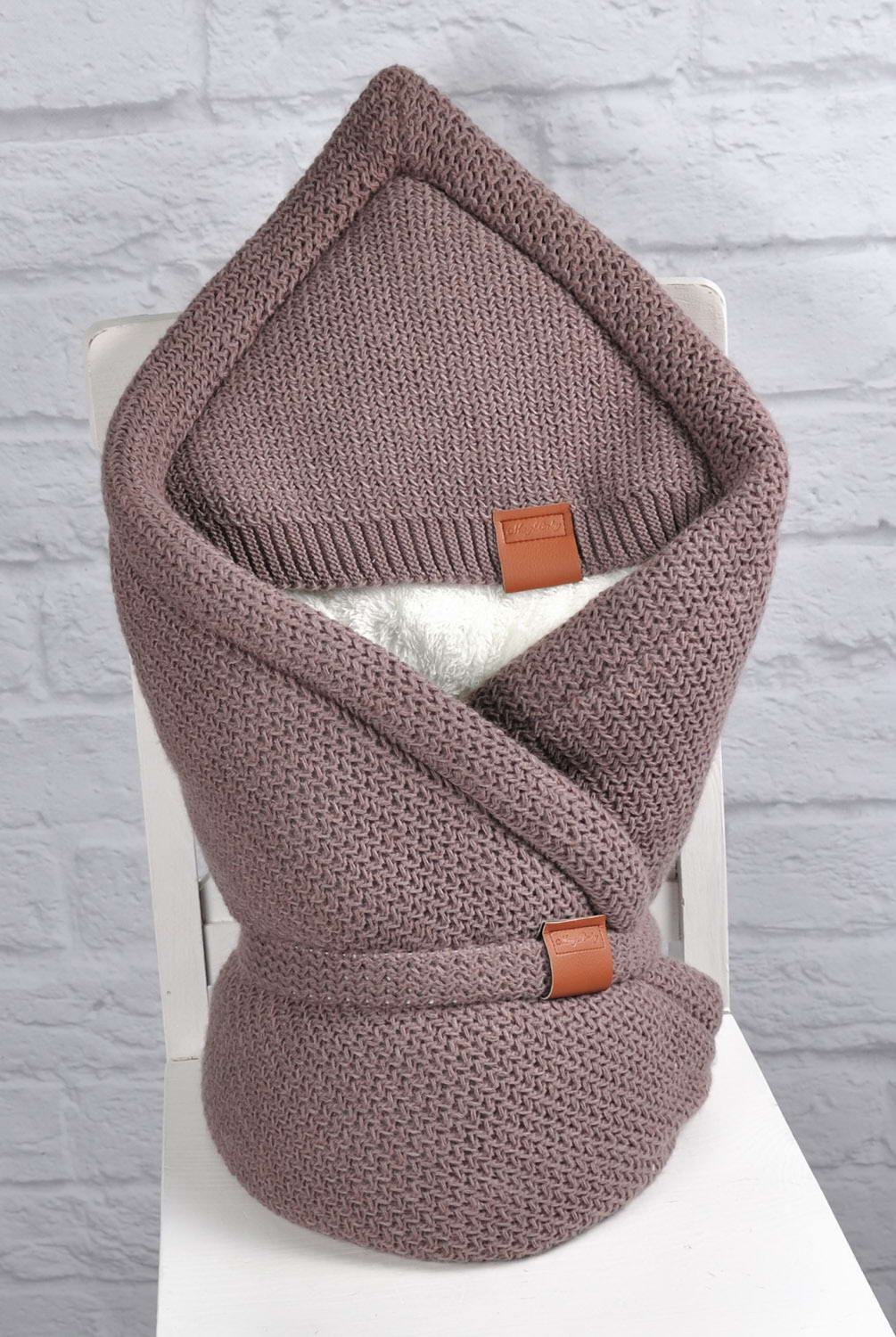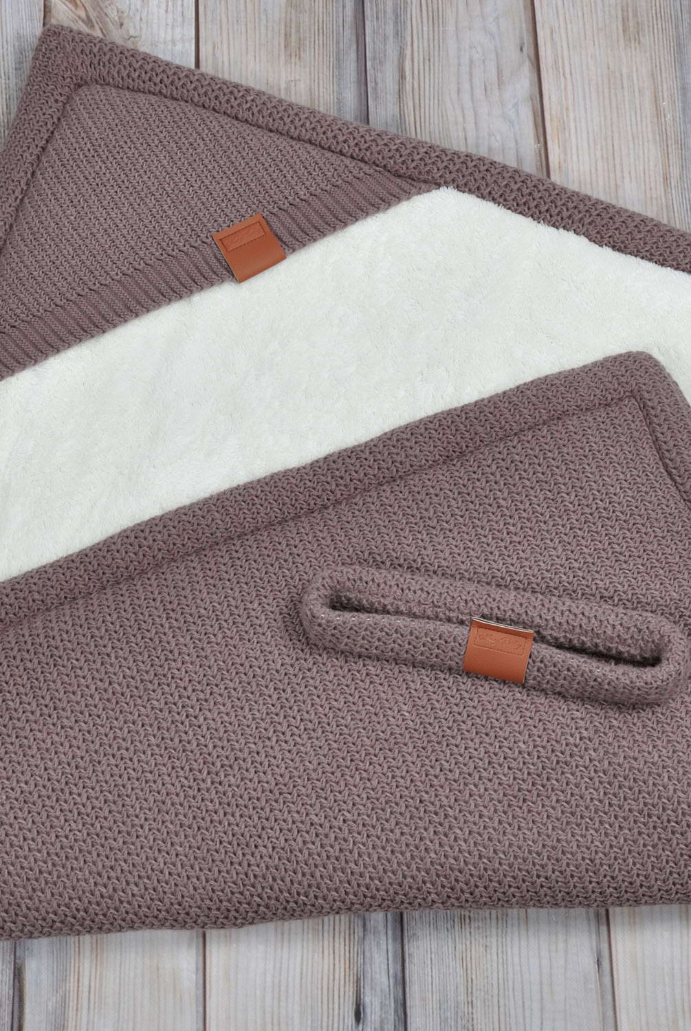 Конверт-ковдра на виписку Familia кольору капучино. В'язане полотно зроблено з дуже щільної в'язки і має значні розміри 95 * 95 см. Тепло конверту надає дуже м'яка плюшева махра і силіконізований утеплювач 200 щільності. У набір до ковдри йде пояс-резинка. А ось «смачним» конверт робить поєднання обробки з еко-шкіри з текстурою в'язки.
